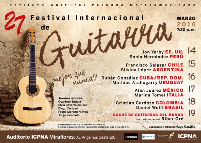 Después de veintisiete ediciones, el Festival Internacional de Guitarra ya puede ser considerado como uno de los encuentros musicales más longevos en América Latina. Este año presenta a importantes guitarristas que llegan a nuestro país: Silvina Liliana López (Argentina), Daniel Wolff (Brasil), Cristian Cardozo (Colombia), Francisco Salazar (Chile), Rubén González Ávila (Cuba), Jon Yerby (Estados Unidos), Marina Tomei (Italia), Alan Juárez Balderas (México) y Mathías Atchugarry (Uruguay). En representación del Perú, contaremos con la presentación de la maestra Sonia Hernández y del invitado especial Riber Oré. Todos ellos compartirán escenario con jóvenes valores de la guitarra peruana. Clases maestras: del 14 al 18 de marzo, 11:00 a. m. Sesión de guitarreo (alumnos y guitarristas): sábado 19, 11:00 a. m. Conciertos: Auditorio ICPNA Miraflores, 7:30 p. m. S/.30 y S/.20 (lunes a viernes), S/.50 (sábado).