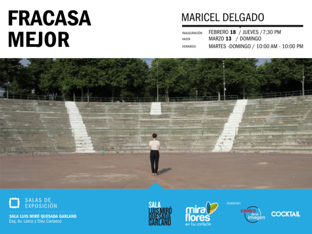Miraflores, 15 de febrero de 2016.- La Municipalidad de Miraflores presenta la segunda muestra de 2016 de su emblemática Sala Luis Miró Quesada Garland (esquina de Av. Larco con Diez Canseco). Se trata de ‘Fracasa mejor’, un trabajo inédito de la artista peruana Maricel Delgado que se inaugura el jueves 18 de febrero, a las 7:30 p.m.