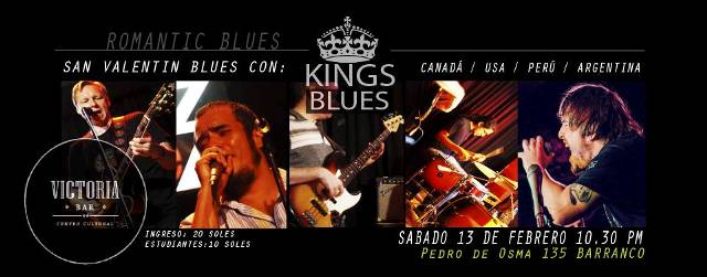 Este Sábado 13, tendremos el agrado de presentar a ROMANTIC BLUES INTERNACIONAL (Pre San Valentín) con KINGS BLUES y aritstas invitados del extranjero para presentarles los temas más románticos de Blues, Rock&Blues, Jazz&Blues, Funky&Blues y temas propios en el Victoria Bar desde las 10pm
