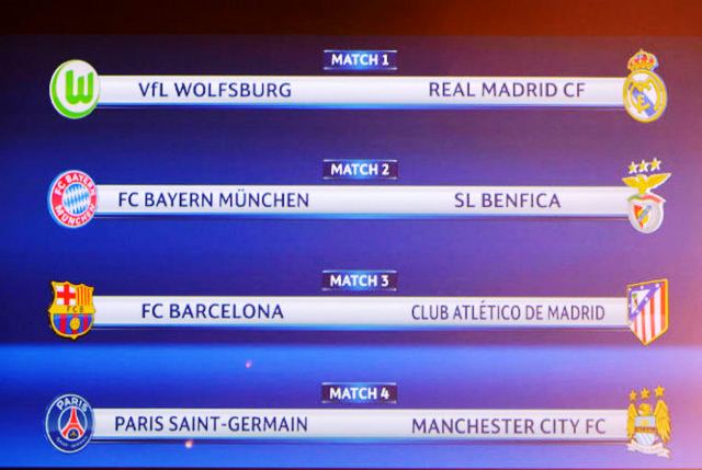 Nyon, mar. 18. A continuación te presentamos el sorteo de los cuartos de final de Liga de Campeones, el cual deparó un duelo español entre Barcelona y Atlético de Madrid, así como el duelo entre Real Madrid- Wolfsburgo; Bayern-Benfica y PSG-Manchester City.