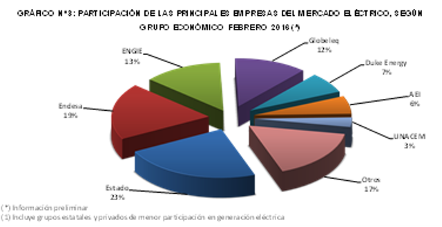 En febrero, la participación de las empresas del Estado en la generación de energía eléctrica para el mercado eléctrico fue de 22,9% respecto del total. Por su parte, la producción de las centrales que pertenecen a los grupos Endesa, Engie, y Globeleq, los más representativos del mercado, tuvieron una contribución de 18,9%, 13,1% y 12,2% respectivamente.