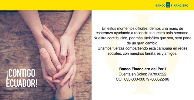 Lima, 21 de abril.- En estos momentos difíciles, el Banco Financiero parte del grupo ecuatoriano Pichincha, se une al dolor de nuestros hermanos del vecino país habilitando una cuenta en soles para donaciones que serán destinadas al apoyo de los damnificados del terremoto en Ecuador.