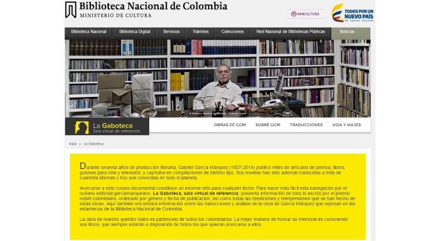 www.bibliotecanacional.gov.co/lagaboteca), se trata, según la institución, del «primer esfuerzo (…) en la red por ordenar y presentar el inmenso corpus bibliografico de Gabriel García Marquez al lector neofito y experto».