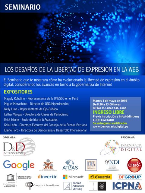 El martes 3 de mayo, al conmemorarse el Día Internacional de la Libertad de Expresión, se llevará a cabo el Seminario “Los desafíos de la libertad de expresión en la web” en el auditorio del Instituto Cultural Peruano Norteamericano (ICPNA) sede Lima (Jr. Cuzco 446, Lima), a partir de las 8:30 hasta las 13:00 horas. Este evento es organizado por Democracia & Desarrollo Internacional (D&D Internacional), en el marco del Programa sobre Democracia Digital con el gentil auspicio de diversas entidades. El objetivo del Seminario es mostrar cómo ha evolucionado la libertad de expresión en el ámbito digital, considerando los avances en torno a la Gobernanza de Internet. Se espera abordar el tema desde dos perspectivas: internacional y nacional. En cada una de