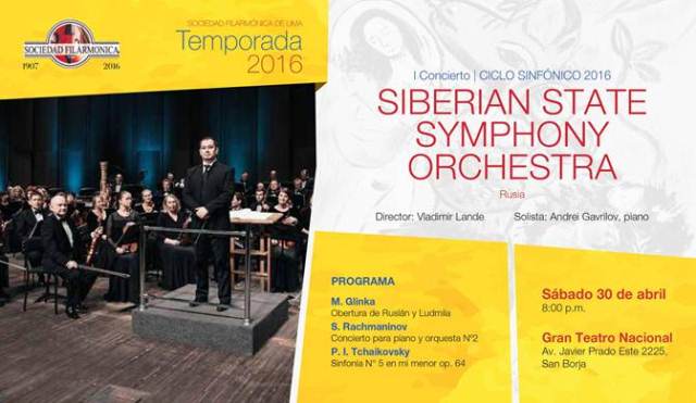 Un extraordinario inicio para un extraordinario ciclo. La Siberian State Symphony Orchestra será la encargada de inaugurar el IV Ciclo Sinfónico de la Temporada 2016 de la Sociedad Filarmónica de Lima. Esta primera presentación se llevará a cabo el sábado 30 de abril a las 8:00 p.m. en el Gran Teatro Nacional.