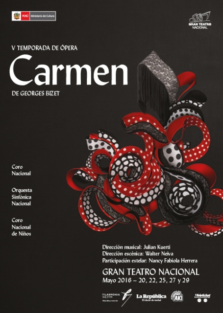 El Ministerio de Cultura se complace en anunciar la quinta edición de su Temporada de Ópera con la puesta en escena de la emblemática Carmen de Georges Bizet, que se presentará los días 20, 25 y 27 de mayo, a las 20:00 horas, y domingos 22 y 29 a las 17:30 horas, en el Gran Teatro Nacional, con la participación del Coro Nacional del Perú, Orquesta Sinfónica Nacional y Coro Nacional de Niños.