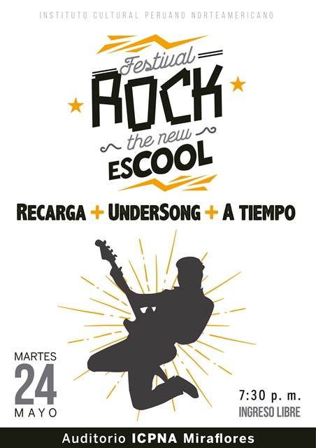 La productora Underpop presenta en el marco del festival The New Escool a las bandas de rock Recarga, Undersong y A Tiempo. El concierto se llevará a cabo el martes 24 de mayo a las 7:30 p.m. en el Auditorio ICPNA Mirafllores (Av. Angamos Oeste 120). El ingreso es libre.