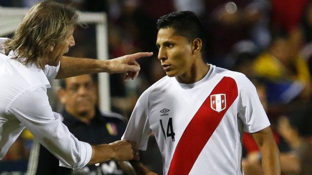 Perú intenta entrar al área tocando en primera. Flores es extremo por izquierda.