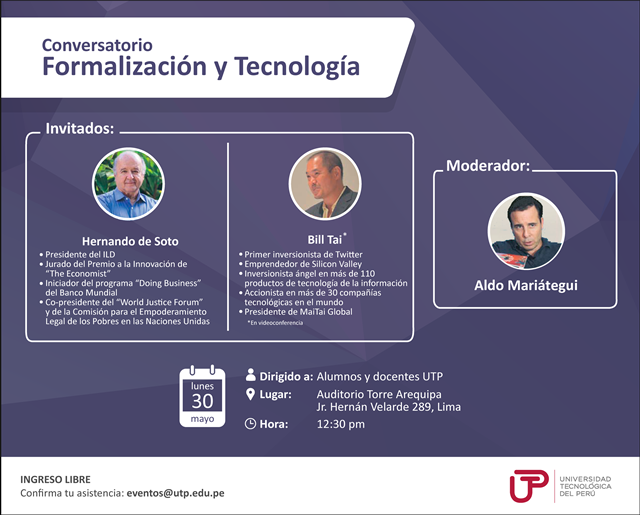 La Universidad Tecnológica del Perú (UTP) y el Instituto Libertad y Democracia (ILD) realizará el próximo lunes 30 de mayo el conversatorio “Formalización y Tecnología” que contará con la exposición de Hernando de Soto (economista) y Bill Tai (primer inversionista de Twitter).
