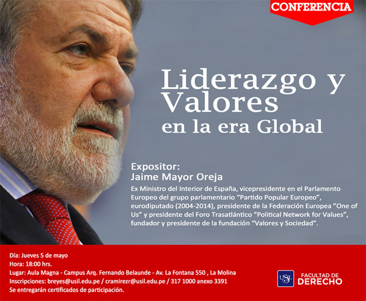 Como parte de su labor formativa y académica, la Facultad de Derecho de la Universidad San Ignacio de Loyola ha organizado la conferencia “Liderazgo y valores en la era global”, dictada por el reconocido político y filántropo español Jaime Mayor Oreja.