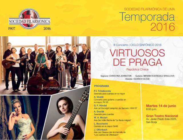 Continuando con su Ciclo Sinfónico, la Sociedad Filarmónica de Lima presenta a la orquesta de cámara checa Virtuosos de Praga este martes 14 de junio a las 8:00 p.m. en el Gran Teatro Nacional. Dirigida por Oldřich Vlček, la orquesta contará con la participación como solistas de la soprano británica Christina Johnston y de la guitarrista eslovaca Miriam Rodriguez Brüllová.