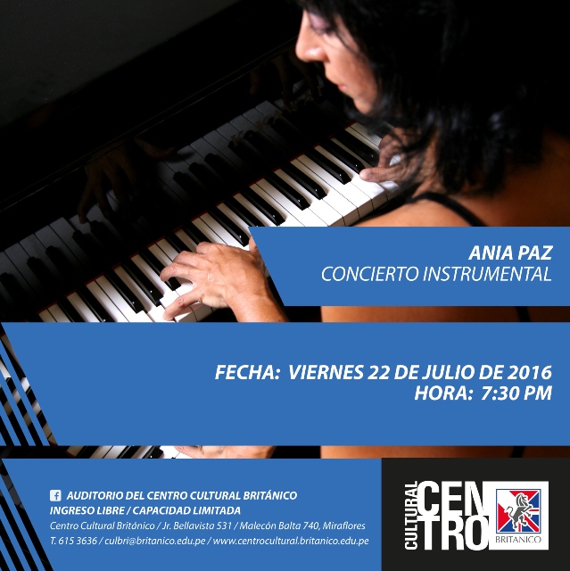 Como parte de un ciclo de Conciertos Instrumentales del Centro Cultural Británico de Miraflores, Ania Paz presenta un concierto de Piano el Viernes 22 de Julio a las 7:30 pm en Jirón Bellavista 531 / Malecón Balta 740 – Miraflores. El ingreso de libre.