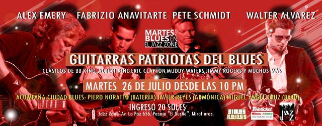 Este martes 26, nos ponemos patrióticamente Blueseros con grandes invitados como Alex Emery desde inglaterra, Pete Schmidt desde canadá, Walter Alvarez y Fabrizio Anavirte en un super versus de Guitarras al lado de la banda emblemática Ciudad blues desde las 10PM en el Jazz Zone Perú