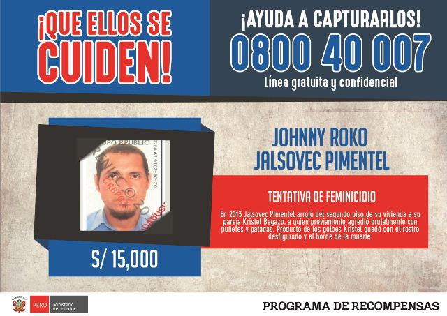 El sector Interior, a través del Programa de Recompensas, está ofreciendo 15 mil soles al ciudadano colaborador que brinde información sobre su paradero. Jalsovec Pimentel se ha convertido en el delincuente número 119 de la lista de los criminales más buscados por la Policía Nacional.