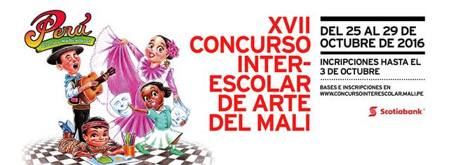 [Lima, agosto de 2016].– El Museo de Arte de Lima – MALI, gracias al auspicio de Scotiabank, lanza la convocatoria para participar del XVII Concurso Interescolar de Arte, dirigido a alumnos de colegios públicos y privados de todo el país. Este año el tema central será “Perú: país diverso y multicultural”, mediante el cual se busca reconocer la importancia de la multiculturalidad y promover la integración de los pueblos costeños, andinos, amazónicos e inmigrantes; que sumados al inmenso patrimonio material e inmaterial, nos hacen un país único del que debemos estar orgullosos.