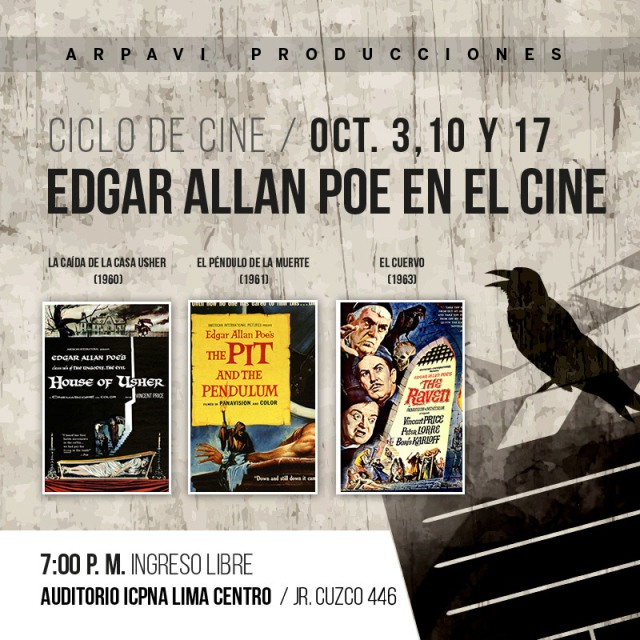 ¿Qué tienen en común el escritor Edgar Allan Poe, el actor Vincent Price y el director de cine de culto Roger Corman? El terror. En octubre presentamos este ciclo especialmente pensado para los amantes del cine de terror, en especial para los admiradores de la obra de Edgar Allan Poe (cuyo deceso ocurrió un 7 de octubre de 1849), del director de cine de culto Roger Corman (en febrero de este año cumplió 90 años de vida) y del actor Vincent Price (quien falleciera un 25 de octubre de 1993), protagonista de las películas seleccionadas: La caída de la casa Usher (1960), El péndulo de la muerte (1961) y El cuervo(1963), relatos inmortales de Allan Poe maestro universal del relato corto. Estas tres películas se proyectarán en octubre como parte del ciclo Edgar Allan Poe en el cine los días 3, 10 y 17 de octubre. La cita es en el Auditorio ICPNA Lima centro ubicado en Jr. Cuzco 446 a las 7:00 p. m. Ingreso libre.