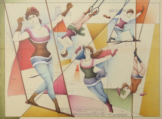 Como dice García Callegari en el texto que acompaña la exposición, “Así, estos planos llenos de líneas y de números y de letras se ven invadidos por imágenes de personas en movimiento, haciendo todo tipo de piruetas aquí y allá, en el aire y en el piso, con cables y cuerdas o sin ellos, pero siempre dando vueltas y vueltas”. Quizás esto sea una metáfora del mundo en el que vivimos actualmente, un mundo que nunca se detiene y donde se tienen que hacer malabares para no perder el equilibrio.