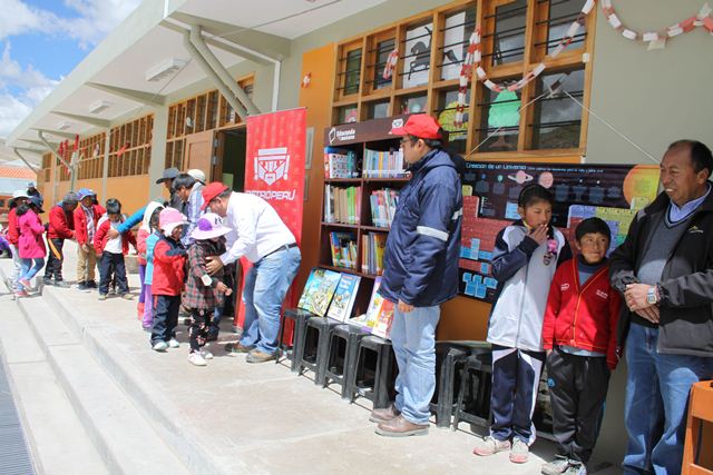 Los alumnos de las instituciones educativas IE 501304 de Oscollo y Pedro Julio Valdivia Deza del distrito de Condoroma se beneficiaron con la entrega de dos módulos de bibliotecas escolares de 200 títulos de libros cada uno entre enciclopedias, diccionarios, atlas y libros escolares de acuerdo a la ruta de aprendizaje que implementa el Ministerio de Educación. Este aporte a la educación de Espinar se concretó gracias al trabajo coordinado de Compañía Minera Antapaccay, Petro Perú y la municipalidad distrital.