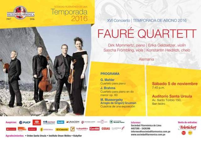 El Cuarteto Fauré llega por primera vez a Lima para ofrecer un concierto el sábado 5 de noviembre a las 7:45 p.m. en el Auditorio Santa Úrsula, como parte de la Temporada de Abono de la Sociedad Filarmónica de Lima.