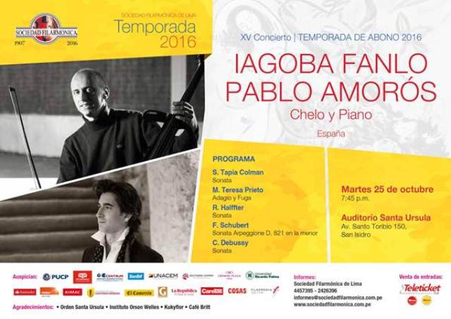 El concierto, organizado por la Sociedad Filarmónica de Lima como parte de su Temporada de Abono, será este martes 25 de octubre a las 7:45 p.m. en el Auditorio Santa Úrsula. La primera parte del programa estará dedicado a los compositores de la Edad de Plata: Sonata para violonchelo y piano, de Simón Tapia Colman; Adagio y Fuga, de María Teresa Prieto Fernández y Sonata para violonchelo y piano op. 26, de Rodolfo Halffter. En la segunda parte, Fanlo y Amorós interpretarán Sonata para arpeggione y piano D. 821, de Schubert y Sonata para violonchelo y piano, de Debussy.