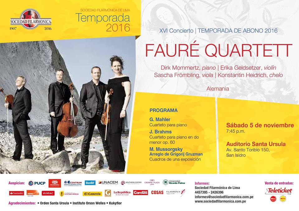 El Fauré Quartet se ha consolidado como uno de los cuartetos de piano más importantes del mundo. Está conformado por Dirk Mommertz (piano), Erika Geldsetzer (violín), Sascha Frömbling (viola) y Konstantin Heidrich (chelo). El afamado conjunto retorna a Lima después de 7 años con un renovado y muy atractivo repertorio.