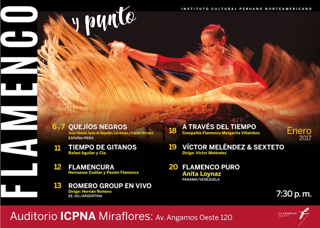 Actualmente, puede considerarse que el flamenco ha dejado deja de ser patrimonio exclusivo de España y Andalucía para convertirse en una manifestación cultural que ha ganado adeptos y cultores en muchas otras partes del globo. Prueba de ello es la permanencia que en nuestro medio tiene el Festival Flamenco y Punto, iniciativa del ICPNA que reúne a los más eximios cultivadores de este arte en el plano local y que también convoca a artistas de talla internacional. Este año empieza el baile y el cante con los españoles Jesús Olmedo y Ayoze de Alejandro, acompañados de los peruanos Leo Amaya y Ernesto Hermoza, quienes presentarán el espectáculo Quejíos negros, los días 6 y 7. Rafael Aguilar y su compañía se harán presentes el miércoles 11 con el espectáculo Tiempo de gitanos. El jueves 12 las hermanas Cuéllar y Pasión Flamenca nos deleitarán con Flamencura. El viernes 13 contaremos con la presencia de un invitado de lujo: el guitarrista argentino afincado en Estados Unidos Hernán Romero, ganador de un premio Grammy, nos presenta su Romero Group, y arrancará los más apasionados arpegios a su guitarra. A continuación, Margarita Villalobos y su compañía alegrarán la noche del miércoles 18 con A través del tiempo, espectáculo que nos narra las diferentes etapas por la que ha pasado el flamenco a lo largo de la historia. El jueves 19 tendremos en el escenario a Víctor Meléndez y su sexteto. Cerramos el festival por todo lo alto con Anita Loynaz, bailaora venezolana de corazón panameño que derrochará su talento en su espectáculo Flamenco puro, el viernes 20. Auditorio ICPNA Miraflores 7:30 p. m. 6 y 7 de enero: S/80; 11 de enero: S/40; 12 de enero: S/50; 13 de enero: S/80; 18 de enero: S/60; 19 de enero: S/40; 20 de enero: S/80.