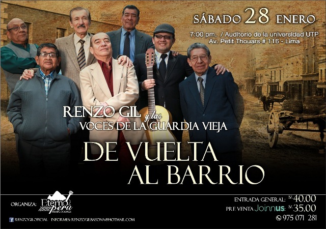 “De vuelta al barrio” es un concierto que se llevará a cabo con motivo del aniversario de Lima, el próximo 28 de enero en el Auditorio de la Universidad UTP, que reunirá a Renzo Gil y las voces de la Guardia Vieja.