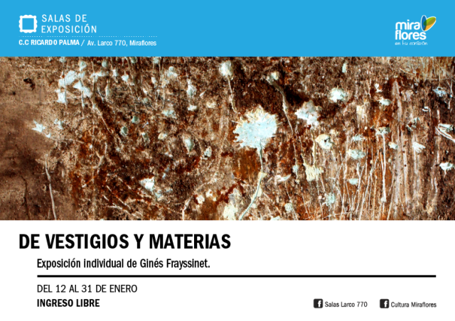 Miraflores, 11 de enero de 2017.- La Municipalidad de Miraflores inaugura, este 12 de enero, la muestra «De vestigios y materias” del artista Ginés Frayssinet. La cita es a las 7:30 p.m. en la Sala Raúl Porras Barrenechea del Centro Cultural Ricardo Palma.