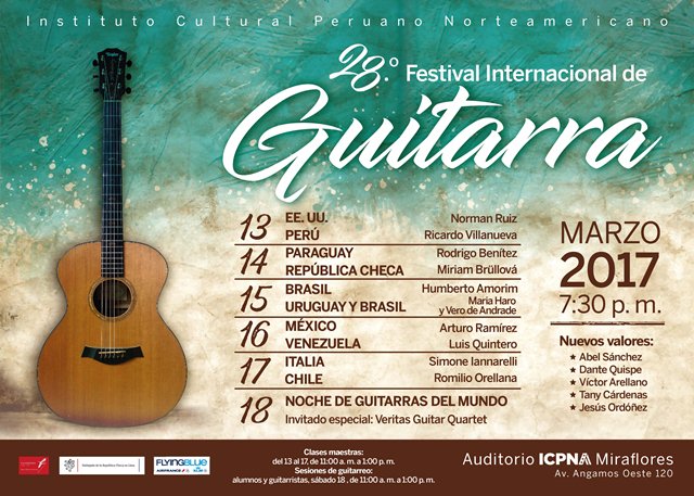 Unos de nuestros más celebrados encuentros musicales llega a su vigésimo octava edición. En esta oportunidad nos acompañan guitarristas de Estados Unidos, Paraguay, República Checa, Brasil, Uruguay, México, Venezuela, Italia, Chile y Perú, acompañados de nuevos valores de la guitarra peruana. Como ya es tradición, el sábado tendremos una Noche de Guitarras del Mundo. 7:30 p. m. S/30 y S/20 (lunes a viernes), S/50 (sábado).