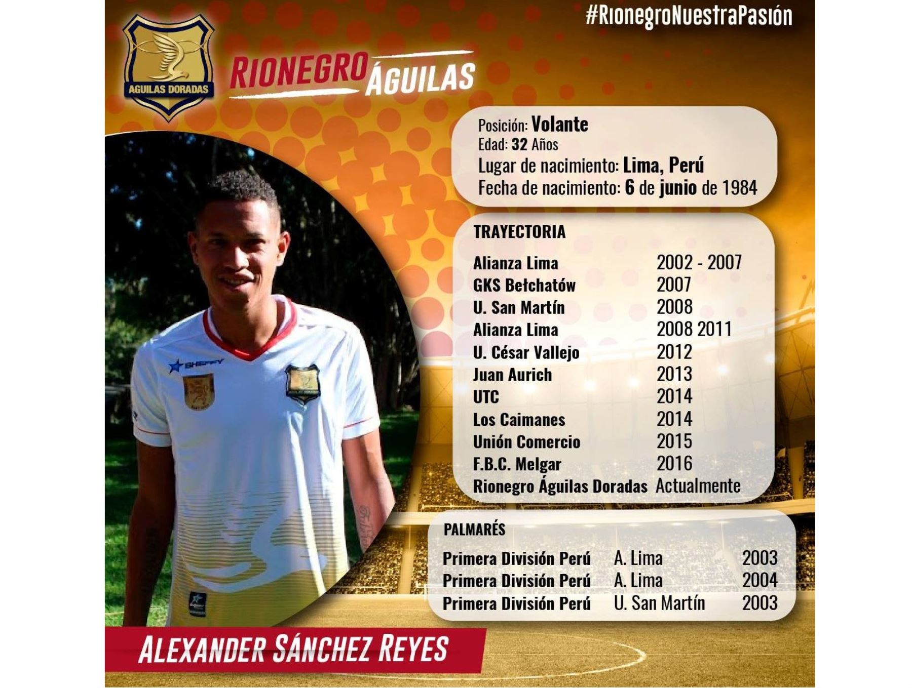 El volante peruano Alexander Sánchez fue presentado este miércoles como nuevo jugador del Rionegro Águilas de la primera división de Colombia que disputará la Conmebol Sudamericana.