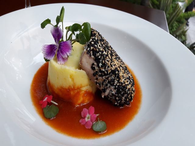 Para el fondo, nuestro chef sorprenderá con tres opciones para elegir entre un lomo a la hierba luisa con salsa de curry y coco servido con croqueta de arroz al panco; pescado en costra de ajonjolí con puré y salsa parihuela ó un Filete de pollo relleno con queso y pecanas acompañando de papas nativas al romero.