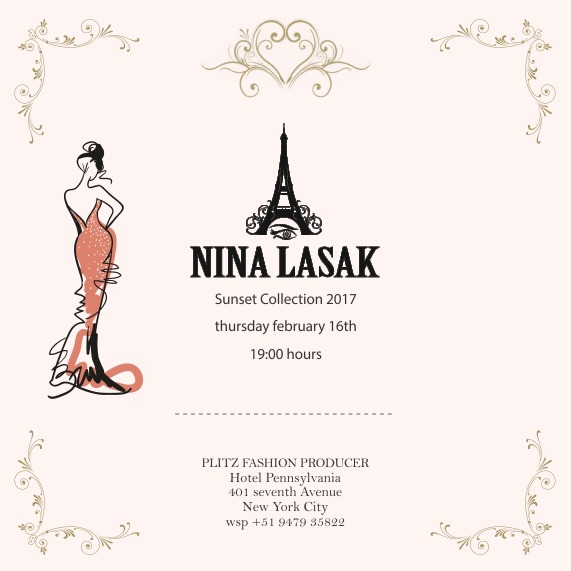 La destacada diseñadora de modas Nina Lasak presentará su nueva colección Sunset en la pasarela del New York Fashion Week . Este gran evento se desarrollará el 16 de febrero próximo en el Hotel Pennsylvania y contará con la participación de 20 diseñadores reconocidos a nivel mundial.