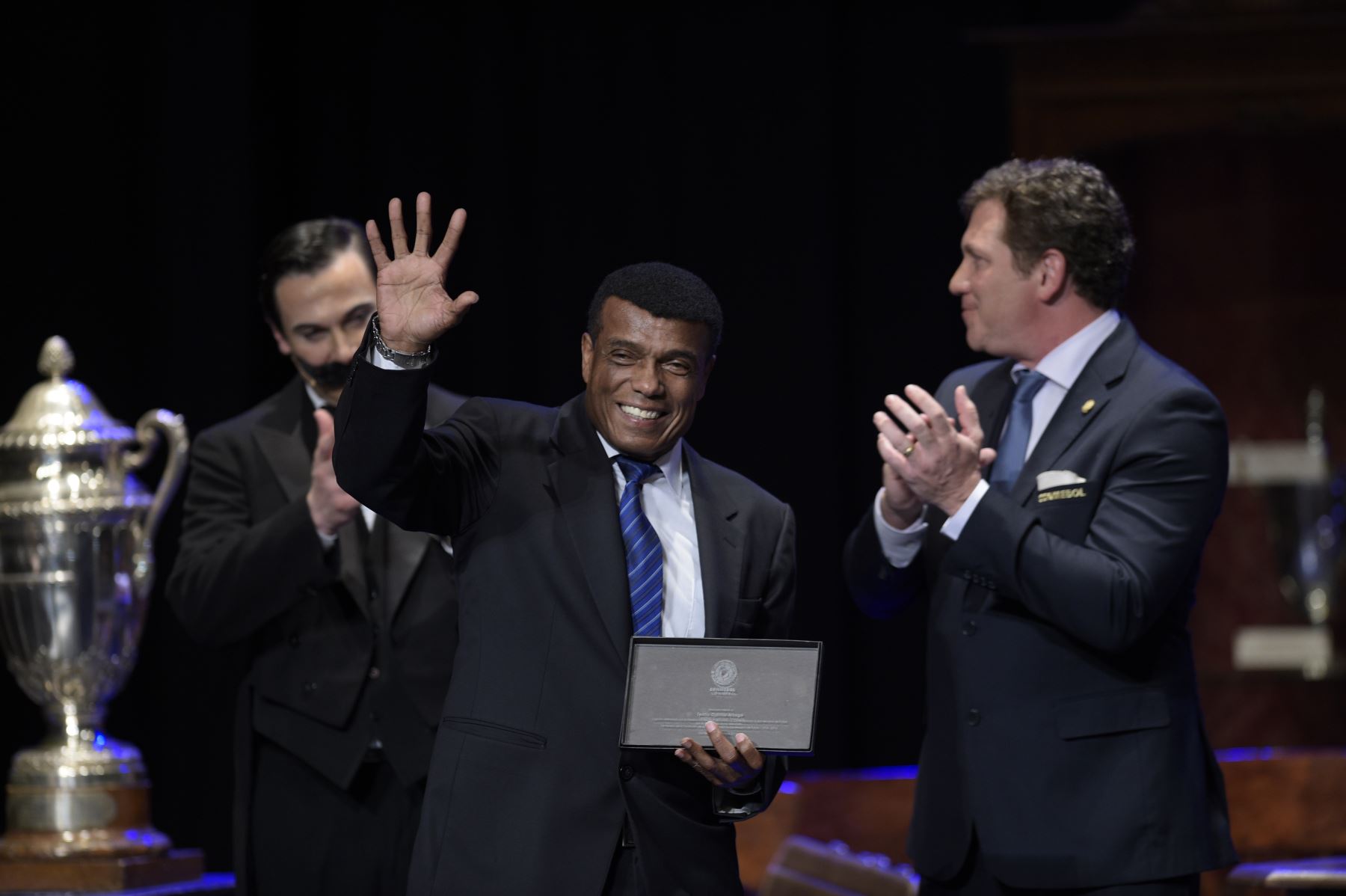El teatro Macció de San José fue el escenario donde la Conmebol rindió homenaje a los dirigentes y jugadores que hicieron a la grandeza del fútbol sudamericano, en el marco de la gala de conmemoración de los 100 años de la Confederación Sudamericana de Fútbol.
