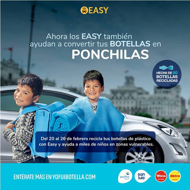 Lima, 21 de febrero de 2017.- EASY participa de manera activa en la campaña organizada por Pacífico Seguros, Agua San Luis, Wong y Metro “Yo fui botella”, a realizarse del 20 al domingo 26 de febrero, que busca recolectar la mayor cantidad de botellas plásticas para crear ponchilas a ser distribuidos en las zonas vulnerables al friaje.