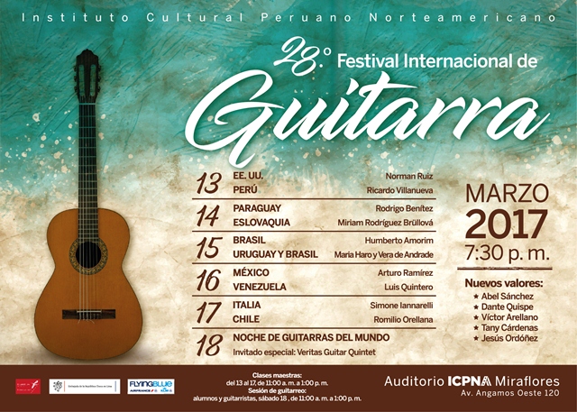 Uno de los eventos musicales más emblemáticos de Lima, el Festival Internacional de Guitarra organizado por el ICPNA, presenta un especial repertorio que abarca cuatro continentes. Participan eximios representantes provenientes de 10 países: Brasil, Chile, Eslovaquia, Estados Unidos, Italia, México, Paraguay, Perú, Venezuela, Uruguay. Los conciertos serán en el Auditorio ICPNA Miraflores a las 7:30 p.m. Las entradas cuestan S/. 30 y 20 (de lunes a viernes) y S/. 50 (sábado). Además, los artistas invitados ofrecerán clases maestras de ingreso libre a las 11:00 a.m. los días de sus funciones.