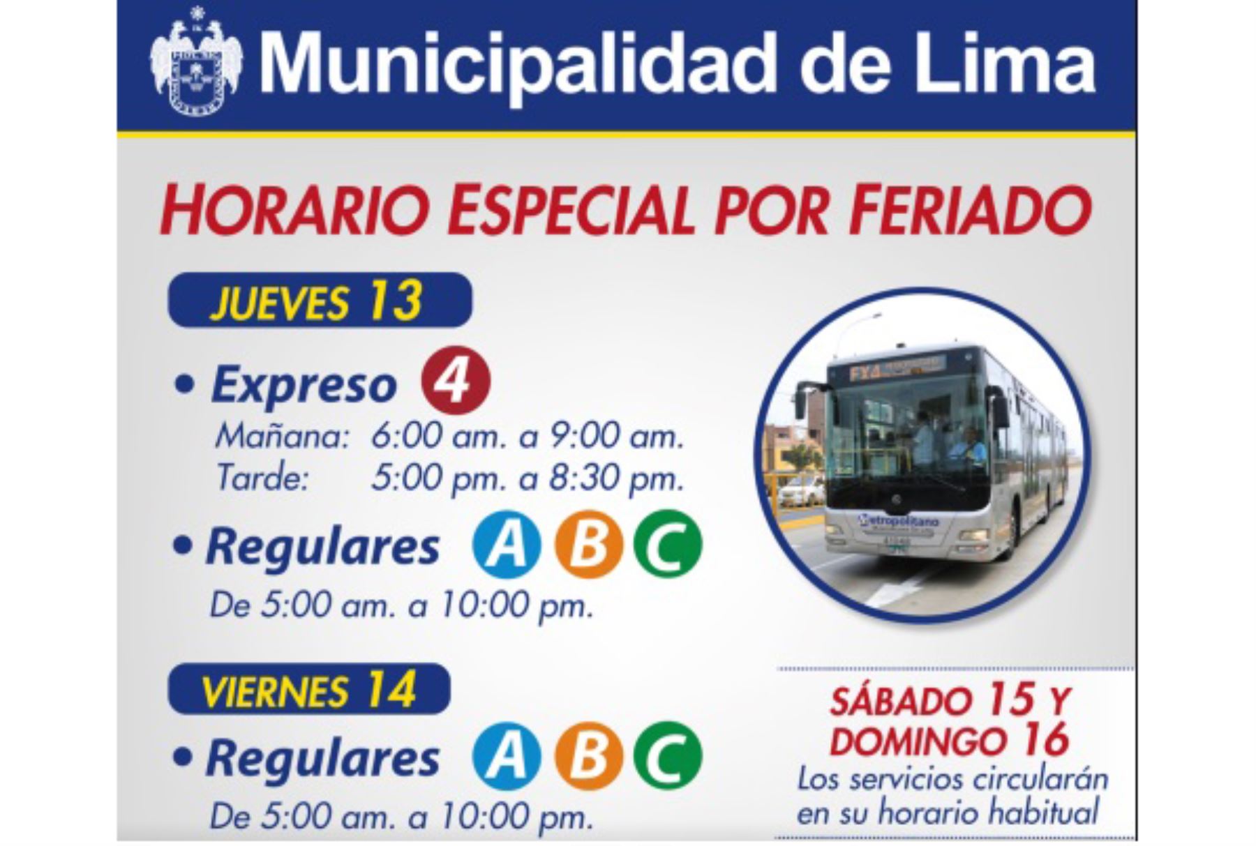 El sistema de El Metropolitano ofrecerá su servicio en horarios especiales durante los días feriados de Semana Santa, informó hoy Protransporte.