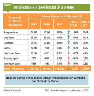 De acuerdo al Área de Inteligencia de Mercados -CCEX, en los tres primeros meses las importaciones de productos por el Día de la Madre sumaron US$145 millones, lo que significó un crecimiento en valor de US$11 millones, es decir 8,2% más respecto al mismo periodo del año anterior (US$134 millones).