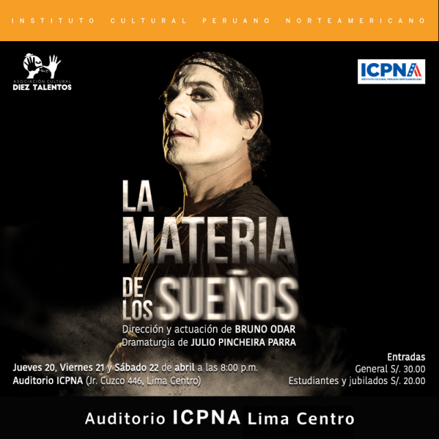 Bruno Odar interpreta y dirige “La Materia de los Sueños”, del dramaturgo chileno Julio Pincheira, un espectáculo unipersonal que tuvo gran acogida en su primera temporada, donde se cuestiona al dramaturgo más destacado de todos los tiempos, William Shakespeare. El espectáculo, de carácter minimalista extremo, se sostiene sobre la capacidad interpretativa del protagonista, quien debe ejecutar fragmentos de monólogos de los personajes femeninos de las obras de Shakespeare, a la vez que interpela al público.