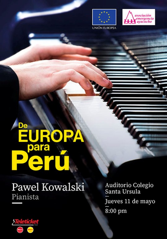 El reconocido pianista polaco Pawel Kowalski se presenta en nuestro país para presentar el recital “De Europa para Perú”, un único concierto el 11 de mayo a las 8 pm en el auditorio del Colegio Santa Úrsula gracias a la Delegación de la Unión Europea en el Perú y a la Asociación Emergencia Ayacucho.