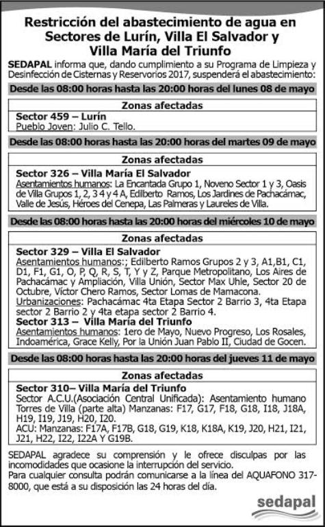 El martes 9 de mayo, 14 asentamientos humanos de Villa El Salvador se verán afectados por la restricción. Al día siguiente el corte se realizará en 25 asentamientos humanos y tres urbanizaciones de Villa El Salvador y en seis asentamientos humanos de Villa María del Triunfo.