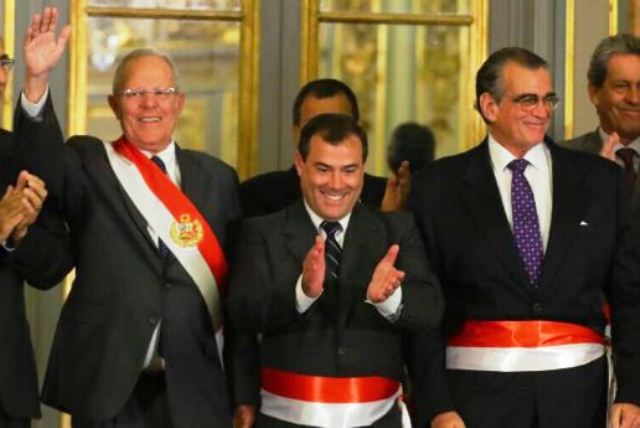 Lima, may. 25. El presidente de la República, Pedro Pablo Kuczynski, tomó hoy juramento a los nuevos ministros de Transportes y Comunicaciones, Bruno Giuffra Monteverde, y de la Producción, Pedro Olaechea Álvarez-Calderón.
