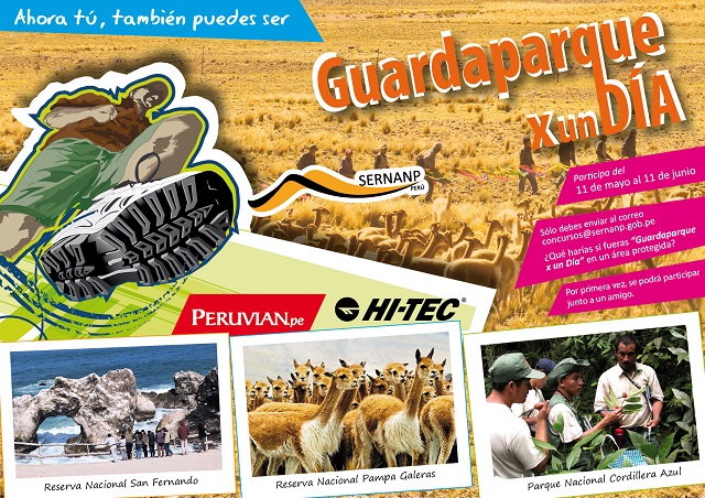 Volvió “Guardaparque x un día”. En su sexta edición este concurso organizado por el Servicio Nacional de Áreas Naturales Protegidas por el Estado (SERNANP) te brinda la oportunidad de vivir una gran experiencia llena de emoción y aprendizaje en tres áreas naturales protegidas como son el Parque Nacional Cordillera Azul (San Martín), la Reserva Nacional Pampa Galeras Bárbara D´Achille (Ayacucho) y la Reserva Nacional San Fernando (Ica).