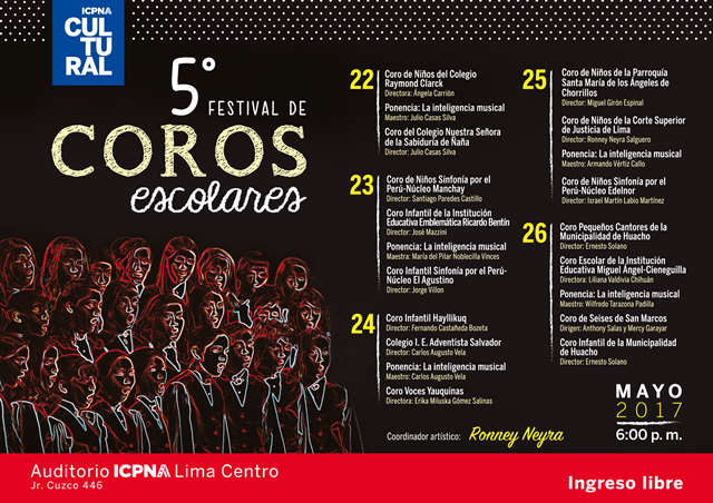 Titulado este año como Los niños embajadores de la música, este festival ha ido ganando adeptos con el correr del tiempo. En su quinta edición el Festival de Coros Escolares constituye un icono en nuestra sociedad, resaltando los talentos de los más pequeños y dando a conocer su expresión artística por medio de la voz. En el evento participarán más de veinte coros escolares y habrá ponencias cada día en las que se trate el tema de la enseñanza del canto coral, el cual es un medio de conexión con la música de los compositores de todas las épocas. La cita es en el Auditorio ICPNA Lima Centro (Jr. Cuzco 446) del lunes 22 al viernes 26 de mayo a las 6:00 pm. El ingreso es libre.