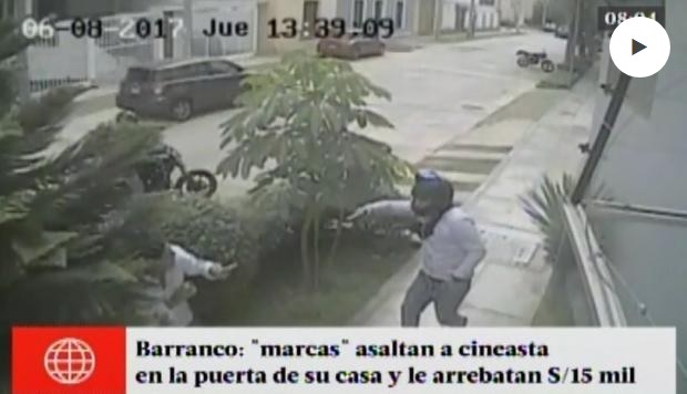 El delincuente armado amenaza al cineasta y empieza un forcejeo casi mortal. El cineasta intenta lanzar al comienzo el fajo de billetes sobre la puerta de su edificio, pero falla, y es empujado, quien le dispara y forcejea con él en el jardín. El delincuente lo golpea en la cabeza con la cacha de la pistola hasta que la víctima deja el dinero en el piso. El segundo marca que iba en la moto hace un disparo al aire. El ladrón busca el fajo de dinero en los arbustos, el cineasta ensangrentado reacciona e intenta lanzar el fajo hacia el edificio. Los billetes vuelan por todas partes mientras la víctima levanta los brazos rendido. El delincuente recoge los billetes del piso y huye con su cómplice en una moto. Inmediatamente aparece un patrullero de Barranco, pero era tarde porque los marcas escaparon.
