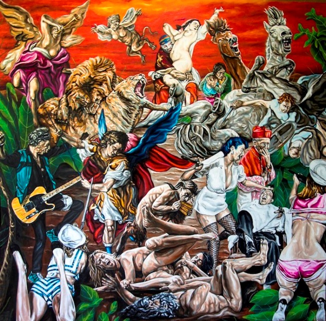 “Personajes de distintas épocas conviven en mi obra, ya que somos la suma de todos los acontecimientos que han ocurrido a lo largo de la historia de la humanidad, … una sociedad egoísta y caótica … Tal vez la solidaridad llegue al ser humano cuando absolutamente todos estemos en desgracia, ciegos todos como en el libro “Ensayo sobre la ceguera” de José Saramago, necesitamos el uno del otro para salir adelante y de esta manera dejar de lado todas nuestras diferencias.”