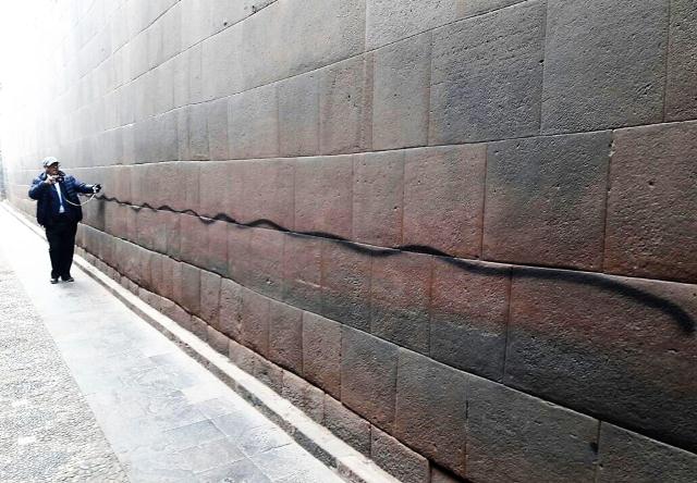 Cusco, jun. 16. Los especialistas de la Dirección Desconcentrada de Cultura de Cusco culminaron la limpieza de una pinta realizada en el muro posterior del complejo arqueológico del Coricancha, hecho reportado por los vigilantes la madrugada de ayer.
