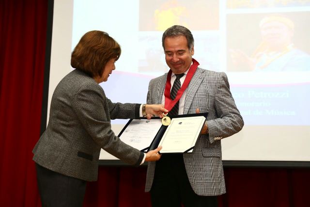 Lima, 18 de julio de 2017.- En una emotiva ceremonia que tuvo lugar en el Auditorio de la Sede Histórica de la, ahora, Universidad Nacional de Música, se distinguió al reconocido tenor lírico y Congresista de la República, Francesco Petrozzi, como Profesor Honorario de dicha institución.