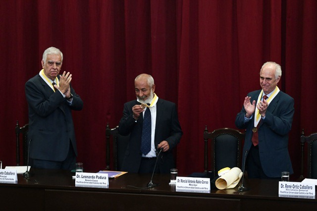 El Dr. Marcial Rubio, rector de la PUCP, entregó a Padura la medalla y la resolución que acredita su nombramiento y agradeció al escritor por aceptar el honor que la PUCP le confiere. En su discurso de agradecimiento, el Dr. Padura dijo que es la primera vez que recibe un reconocimiento académico de este nivel y que es para él un doble honor, pues su relación con el Perú, a través de su literatura, es sanguínea.