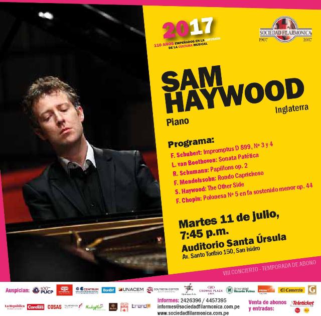Continuando con la Temporada de Abono de la Sociedad Filarmónica de Lima, este martes 11 de julio a las 7:45 p.m. en el Auditorio Santa Úrsula se presenta el pianista inglés Sam Haywood, quien vuelve a Lima para ofrecer un concierto con un programa diverso, con obras de obras de Schubert, Beethoveen, Rachmaninov, Schumann, Mendelsohnn, Chopin, así como de su propia autoría.