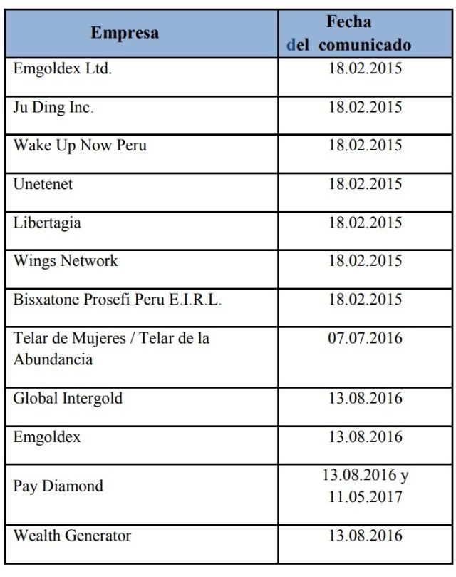 La Superintendecia de Banca, Seguros y AFP (SBS) publicó una Lista de Empresas Online que se dedican a realizar la «Estafa piramidal». Estas empresas ofrecen supuestas ganancias, las cuales provienen del dinero que entregan los nuevos aportantes, creando un sistema piramidal, donde solo se benefician algunos.